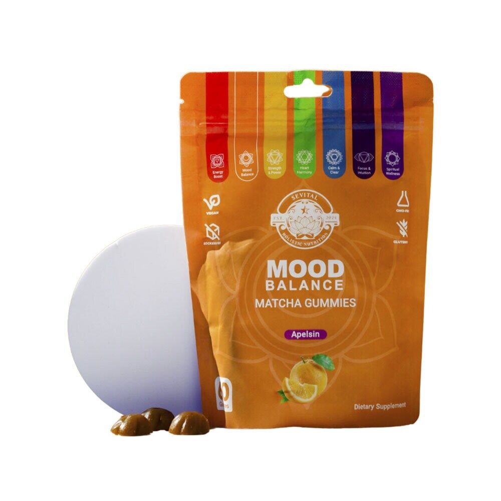 Saffran bidrar till att upprätthålla positiv sinnesstämning och emotionell balans. Matcha och maca är traditionella ingredienser som ofta används i drycker och kost. Den friska smaken av apelsin gör intaget gott och enkelt. Gummies är veganska, sockerfria, glutenfria och GMO-fria.