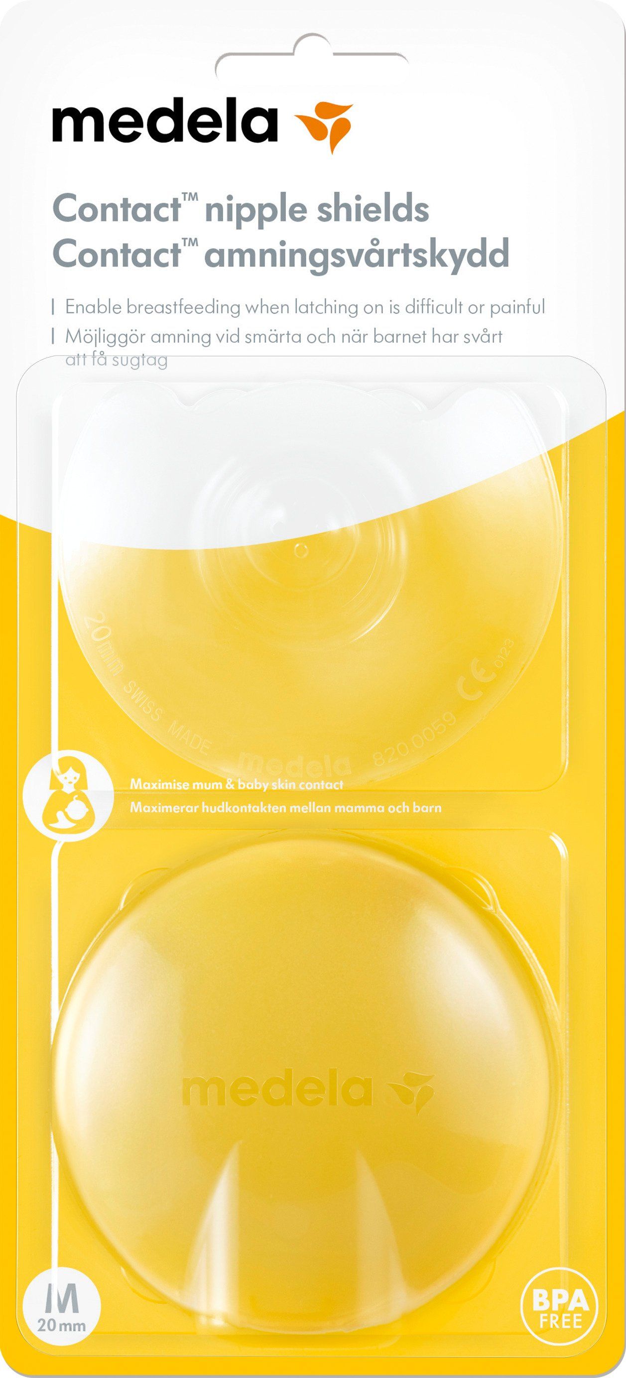 Medela Contact amningsvårtskydd kommer i en praktiskt ask för förvaring och transport. Storlek M är 20 mm.