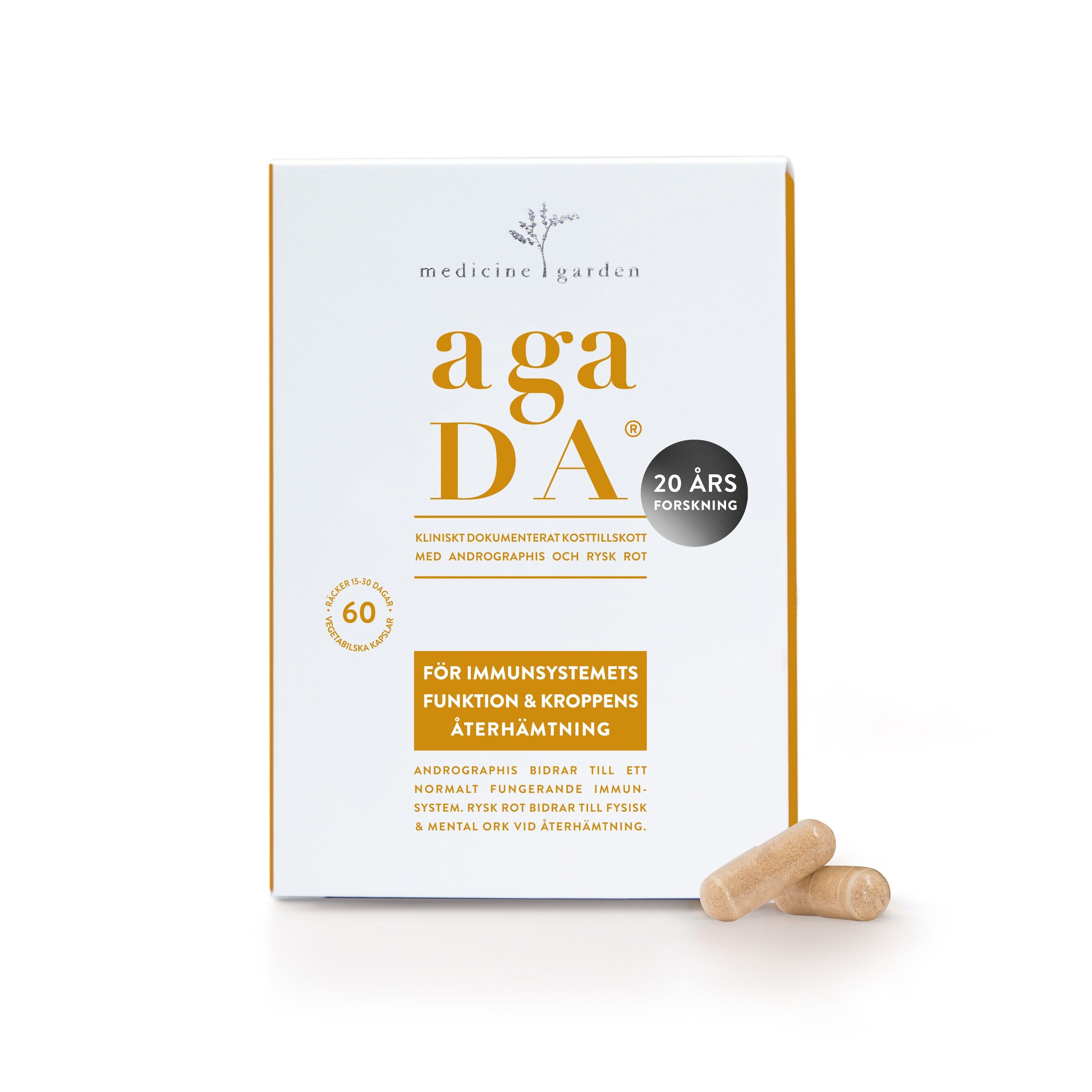 agaDA är för ditt immunsystem och kroppens återhämtning. Upprepade kliniska studier bekräftar användningen och visar att Andrographis (SHA-10®) bidrar till immunsystemets och luftvägarnas normala funktion medan Rysk rot (SHA-3®) bidrar till mental och fysisk ork vid utmattning och trötthet i samband med återhämtning och konvalescens.