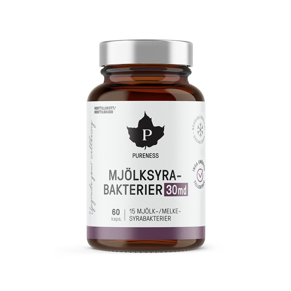 Mjölksyrabakterier 30md från Pureness är en avancerad probiotikaprodukt som innehåller 30 miljarder mjölksyrabakterier per kapsel. Med 15 noggrant utvalda bakteriestammar är denna produkt en av de mest mångsidiga på marknaden. Inulin och frukto-oligosackarider har tillsatts för att stärka bakteriernas hållbarhet och livskraft. Kapslarna är fria från onödiga tillsatser och passar både för daglig användning och kortare behovsperioder.
