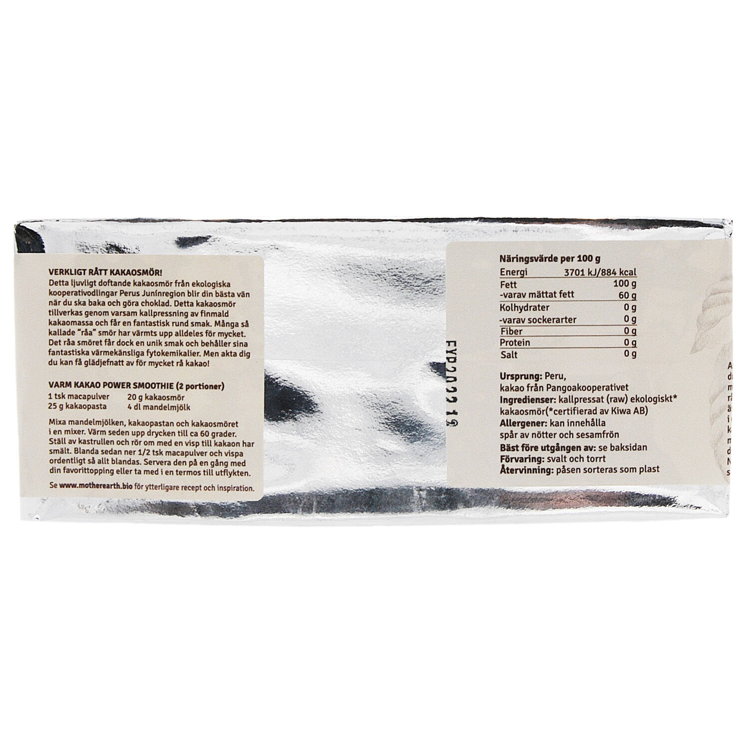 Ingredienser: kallpressat (raw) ekologiskt kakaosmör Ursprung: Peru, kakao från Pangoakooperativet Förvaring: Förvaras torrt och svalt.