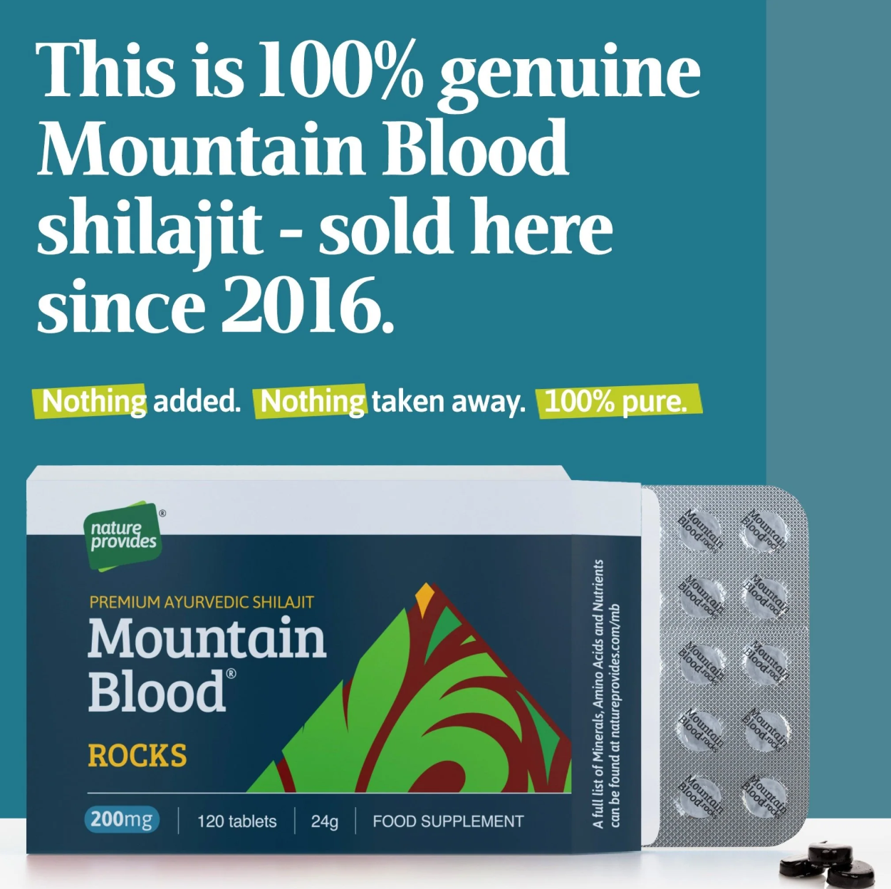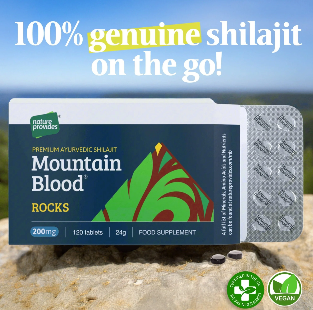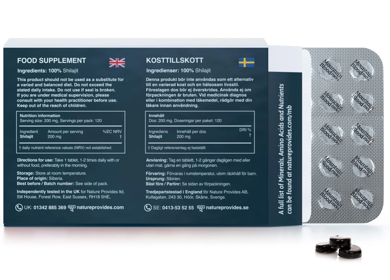 Mountain Blood Rocks är 100 procent äkta shilajit i naturlig hartsform, vilket är torkat och komprimerat till tabletter – en naturlig föda som använts som botemedel i tusentals år. Mountain Blood Rocks stödjer både kropp och sinne på flera sätt. Några av de hälsofördelar som kan upplevas inkluderar: