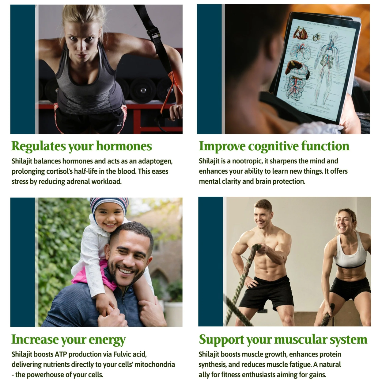 - MUSKELSYSTEMET - Shilajit stödjer muskelväxt, förbättrar proteinsyntesen och minskar muskeltrötthet, vilket gör det till ett effektivt tillskott för träningsentusiaster som strävar efter resultat.