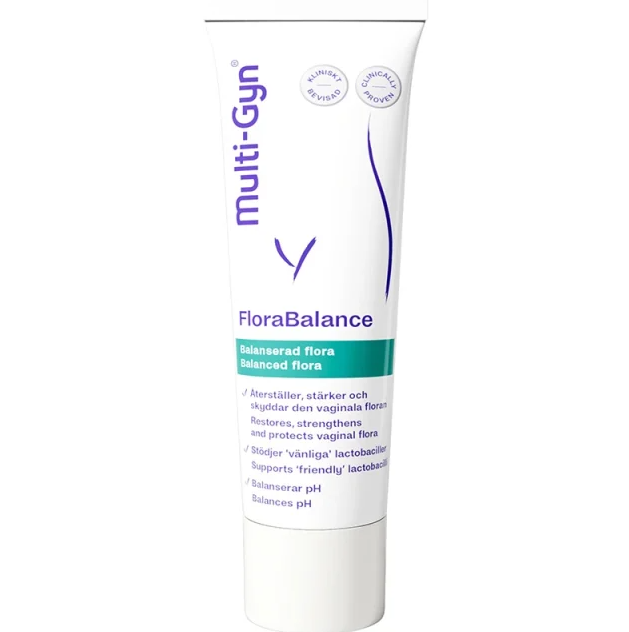 Multi-Gyn FloraBalance Gel är en innovativ gel som hjälper till att balansera pH-värdet och stödja den naturliga vaginalfloran. FloraBalance innehåller en kombination av aloe vera-extrakt och mjölksyra. Aloe vera verkar lugnande och skyddande mot slemhinnorna medan mjölksyra hjälper till att skapa en lätt sur miljö. FloraBalance används främst för att återställa balansen i vaginalfloran när den störs, vilket kan ske av olika orsaker. Den skapar en skyddande barriär över slemhinnorna. Produkten är enkel att använda tack vare den medföljande applikatorn som gör det lätt att applicera gelen inuti slidan. Gelen är icke-fet och lämnar inga fläckar. 50 ml.