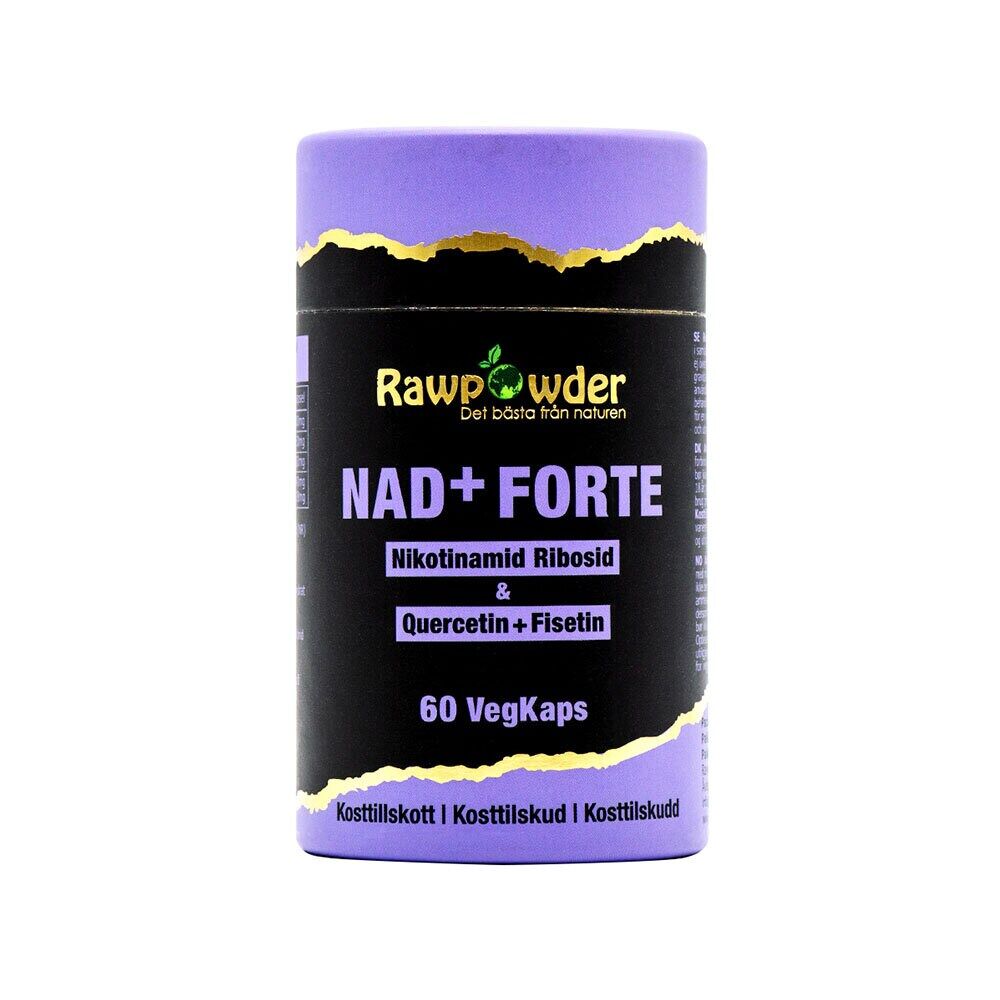 Rawpowders NAD+ Forte är ett kosttillskott som kombinerar nikotinamid ribosid (NAD+), quercetin och fisetin för stöd i energiproduktion, DNA-reparation och cellskydd.