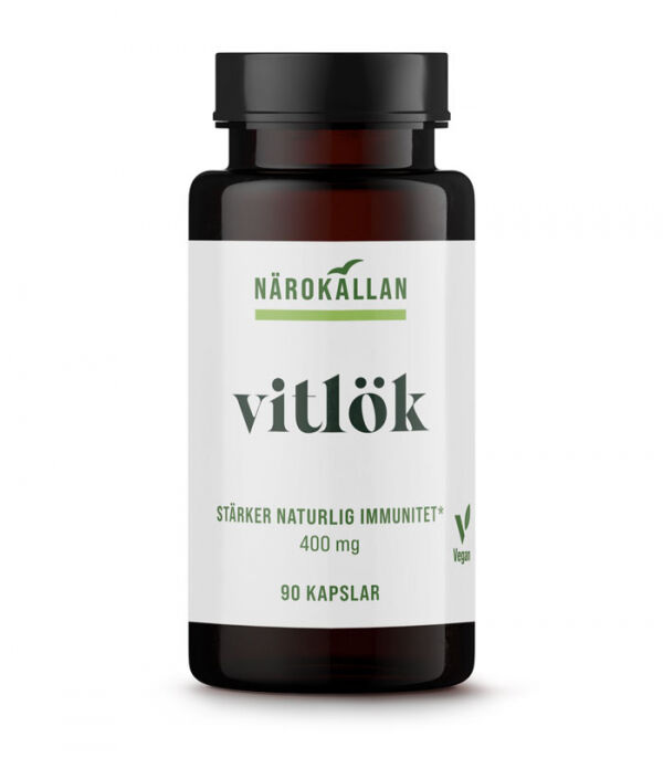 Vitlök innehåller svavelföreningar. Färsk vitlök är det bästa, men vill man inte ta det kan man regelbundet ta ett tillskott. Här får du hela 400 mg nästan luktlöst pulver i kapslar. Kapslarna löser upp sig inom 10 minuter efter nedsväljning.