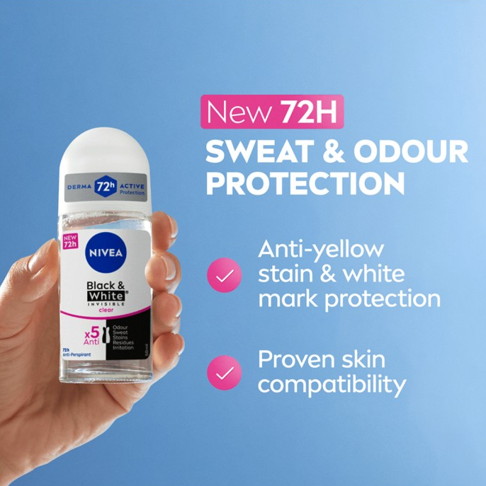 NIVEA Black & White Original Anti-Perspirant är en pålitlig deo roll-on som ger upp till 72 timmars effektivt skydd mot svett och lukt. Denna antiperspirant-deo ger ett skydd mot vita märken på svarta kläder, och minskar även gula missfärgningar på vita kläder tack vare den unika patenterade anti-stain-teknologin. Antiperspirant-deodoranten är skonsam mot huden och ger en bekväm och torr känsla.