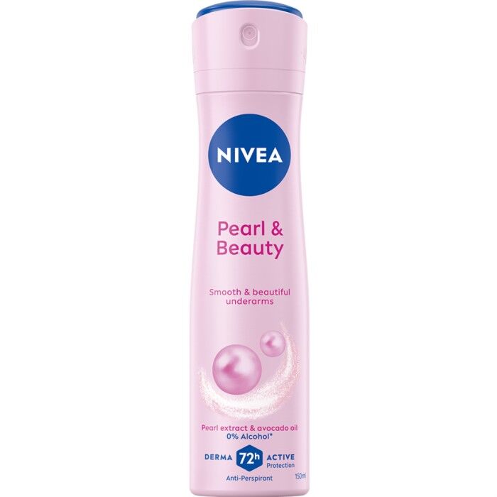 Pearl & Beauty spraydeo har Derma 72h Active-skydd, vilket innebär att den arbetar med huden för att ge ett tillförlitligt och starkt skydd mot svett och lukt, samtidigt som den har en formulering som är snäll mot huden. NIVEA Pearl & Beauty spray passar alla hudtyper.