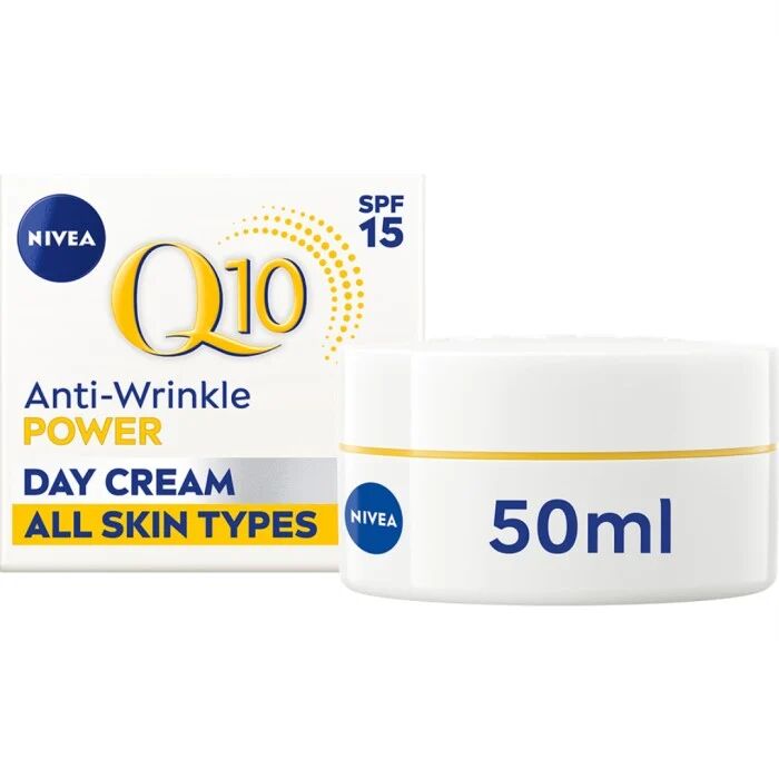 NIVEA Q10 Power Firming Day Cream SPF 15 är en anti-age dagkräm med rik och vårdande textur som återfuktar huden på djupet och ger en omedelbart mjuk och len känsla. Krämen innehåller en dubbel kollagen-booster med ren Q10 och kreatin, som stärker hudens cellkraft och stödjer kollagen- och elastinproduktionen. Hyaluronsyra hjälper till att fylla huden med fukt och låsa in återfuktning för ett slätare och mer spänstigt utseende. Med SPF 15 skyddas huden dessutom mot solens påverkan som kan bidra till förtida hudåldrande. Kliniska studier visar synliga resultat redan efter kort tids användning.