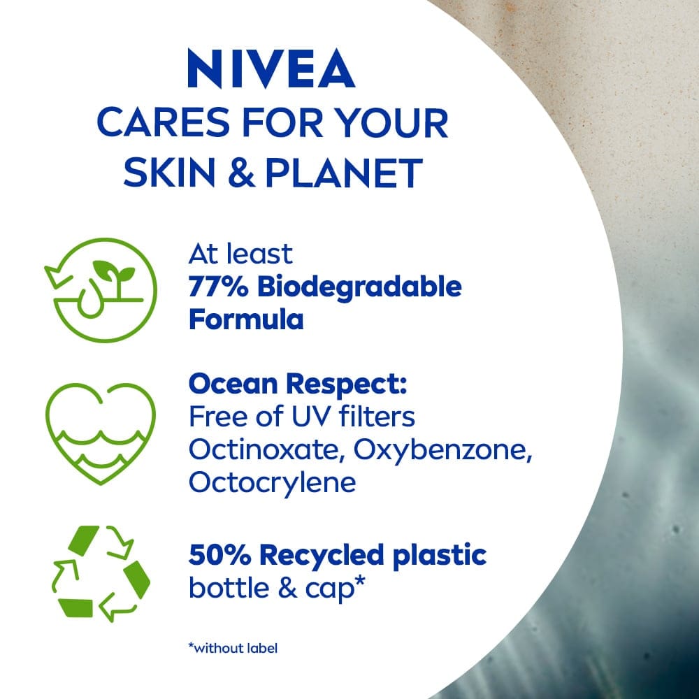 NIVEA SUN Protect & Moisture Sun Lotion är en solkräm med ett medelhögt solskydd SPF 20 som skyddar huden mot UVA-och UVB-strålar samt skyddar mot solbränna och förtidigt åldrande av huden. Niveas solskydd har en vattenresistent formulering och innehåller antioxidanten vitamin E som bidrar till en långvarig och intensiv återfuktning i 48 timmar. Solskyddet är dermatologiskt testat. Denna solskyddskräm innehåller Niveas Ocean Respect-formulering som är fri från UV-filtren octinoxate, oxybenzone och octocrylene.