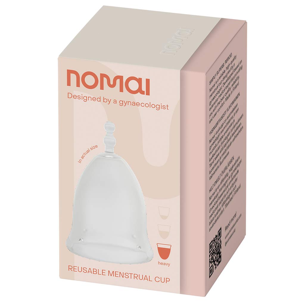 Nomai Menstrual Cup Heavy Clear är ett återanvändningsbart mensskydd med en bra passform, här i den största av tre storlekar. Menskoppen har en vasformad design i ett mjukt material av 100% medicinskt silikon.