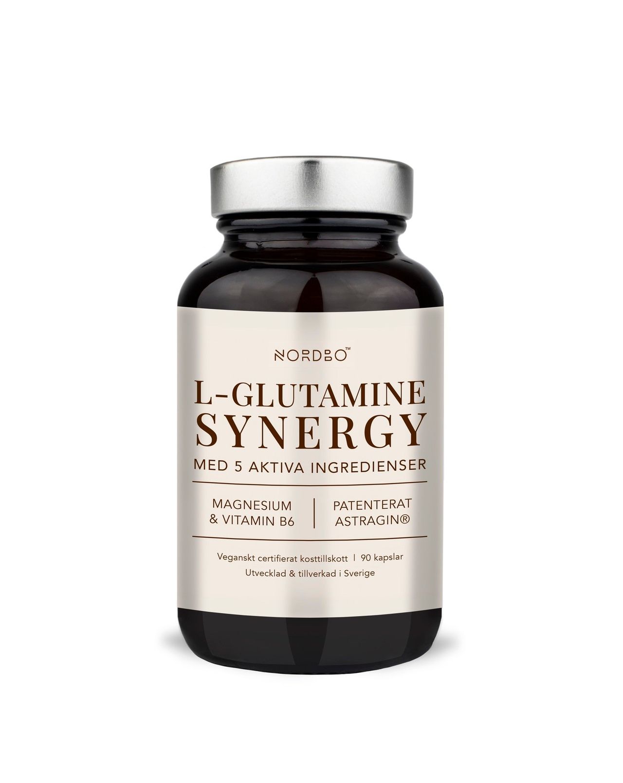 Ge din kropp de bästa förutsättningarna för både inre balans och fysisk återhämtning med Nordbo L-Glutamine Synergy. Detta avancerade komplex kombinerar den viktiga aminosyran L-glutamin med magnesiumbisglycinat, vitamin B6 och det patenterade upptagshjälpmedlet AstraGin®. En synergistisk formula som är lika uppskattad för att stödja en känslig tarm som för att främja musklernas reparation efter ett hårt träningspass.