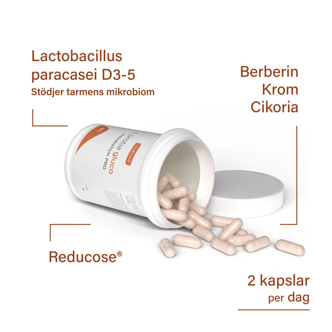 | Huvudingredienser | Berberin, Reducose®, Krom, Cikoria, L. paracasei D3-5 |