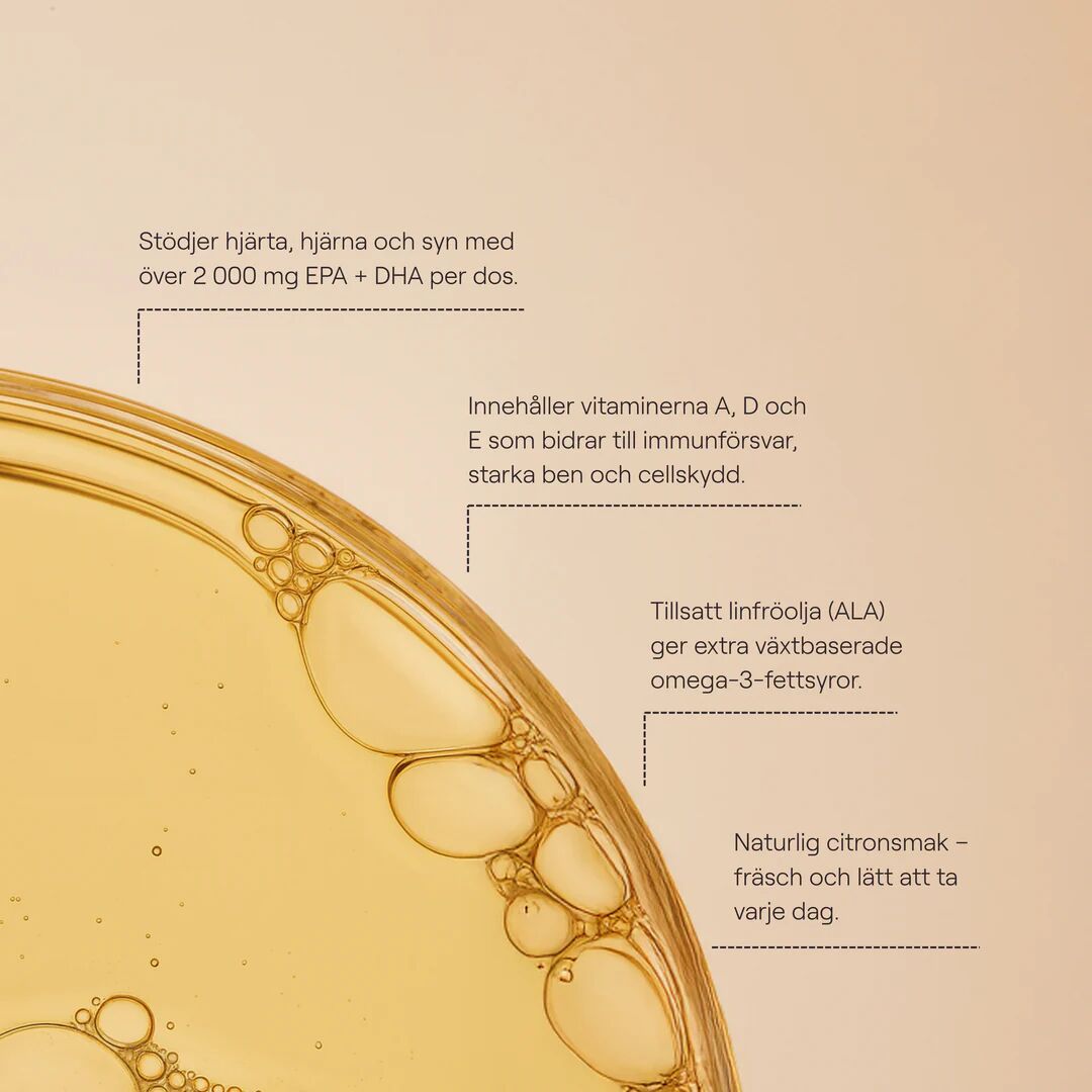Vår OMEGA-3+ levererar över 2 000 mg EPA och DHA per portion, plus linolja för ytterligare vegetabilisk ALA. Denna högkoncentrerade blandning stödjer normal hjärtfunktion, hjärnhälsa och syn, med tillsatt vitamin A, D och E för immunförsvar, starka ben och skydd av celler mot oxidativ stress.