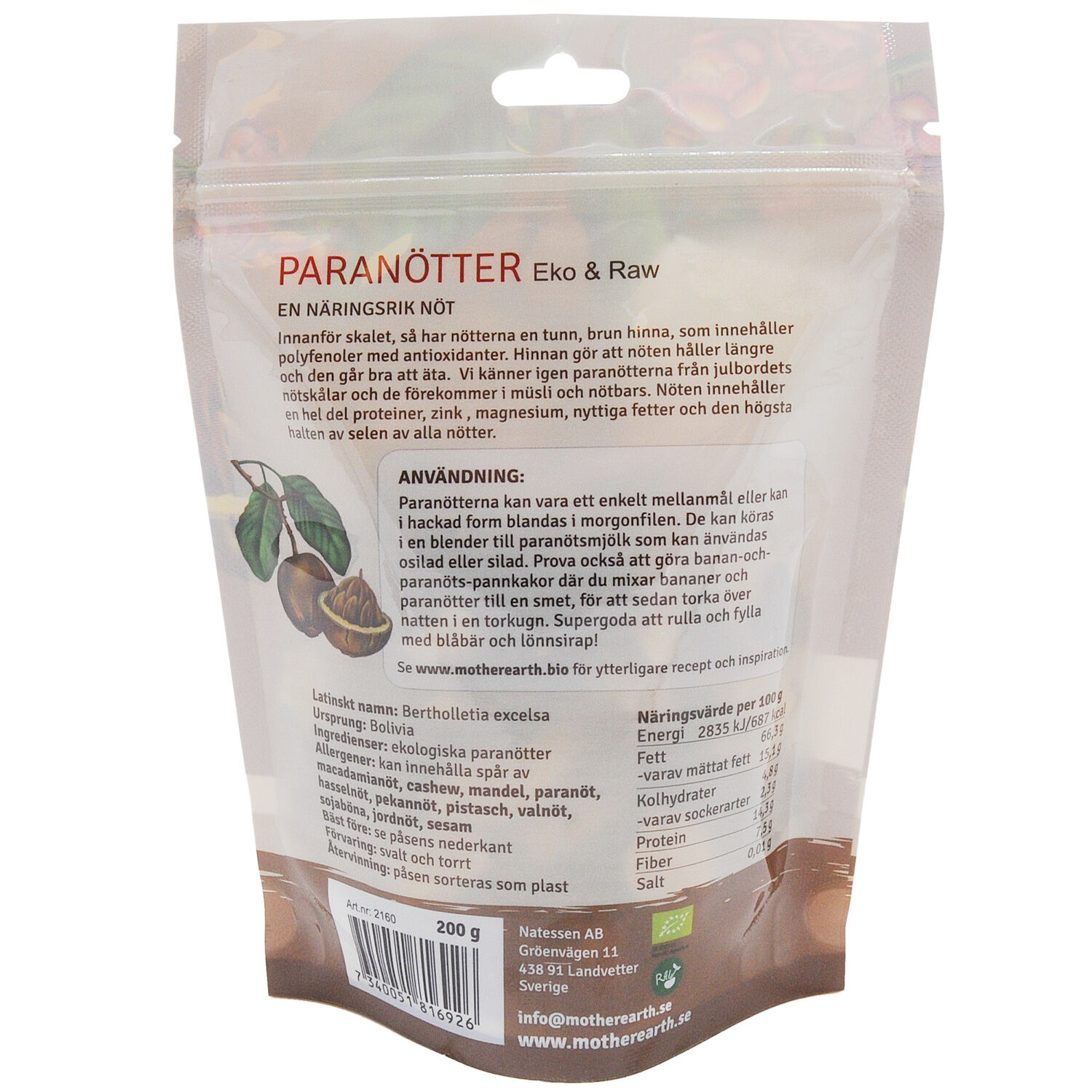 Latinskt namn: Bertholletia excelsa Ingredienser: Ekologiska paranötter Ursprung: Bolivia Förvaring: Förvaras torrt och svalt
