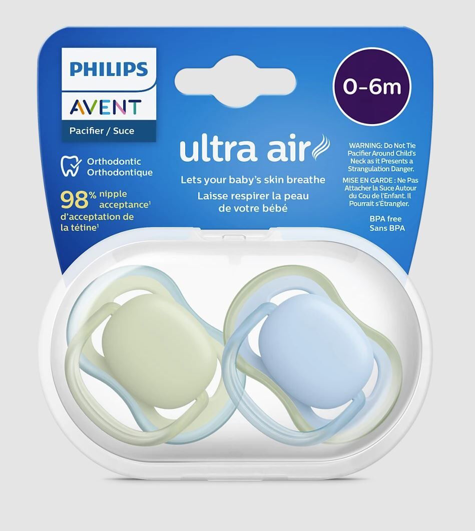 Trösta barnet med en napp som låter huden andas. Philips Avent Ultra Air har extra stora hål som hjälper till att hålla huden torr. Dess lätta sköld är utformad för maximalt luftflöde. Finns i olika färger och utformningar.
