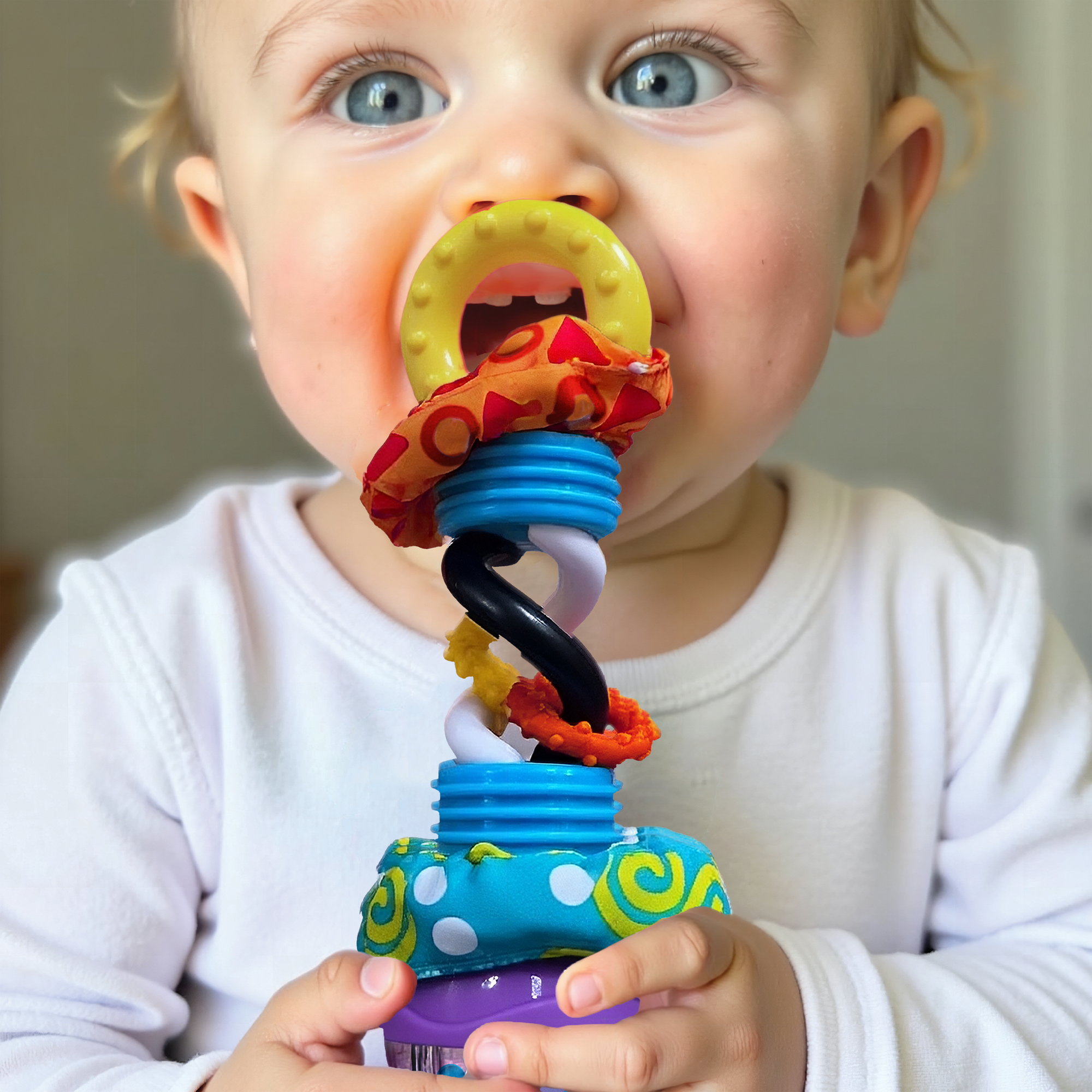 Leksaken är lämplig för bebisar från 3 månader (3m+). Den kan användas som en underhållande aktivitetsleksak i hemmet, på lekfilten eller tas med på språng i vagnen för att hålla barnet engagerat. Låt barnet utforska de olika texturerna, skaka på skallran för att höra ljuden och använda bitringarna för oral stimulans. För att bibehålla god hygien bör leksaken rengöras regelbundet genom att torkas av med en mjuk, fuktig trasa och en mild tvållösning. Produkten ska inte kokas eller sänkas ned helt i vatten, då detta kan skada de inre prasselmaterialen. Läs alltid föreskrifter och bruksanvisningar för produkten innan användning, så att du är väl informerad om både produkten och dess användningsområden.