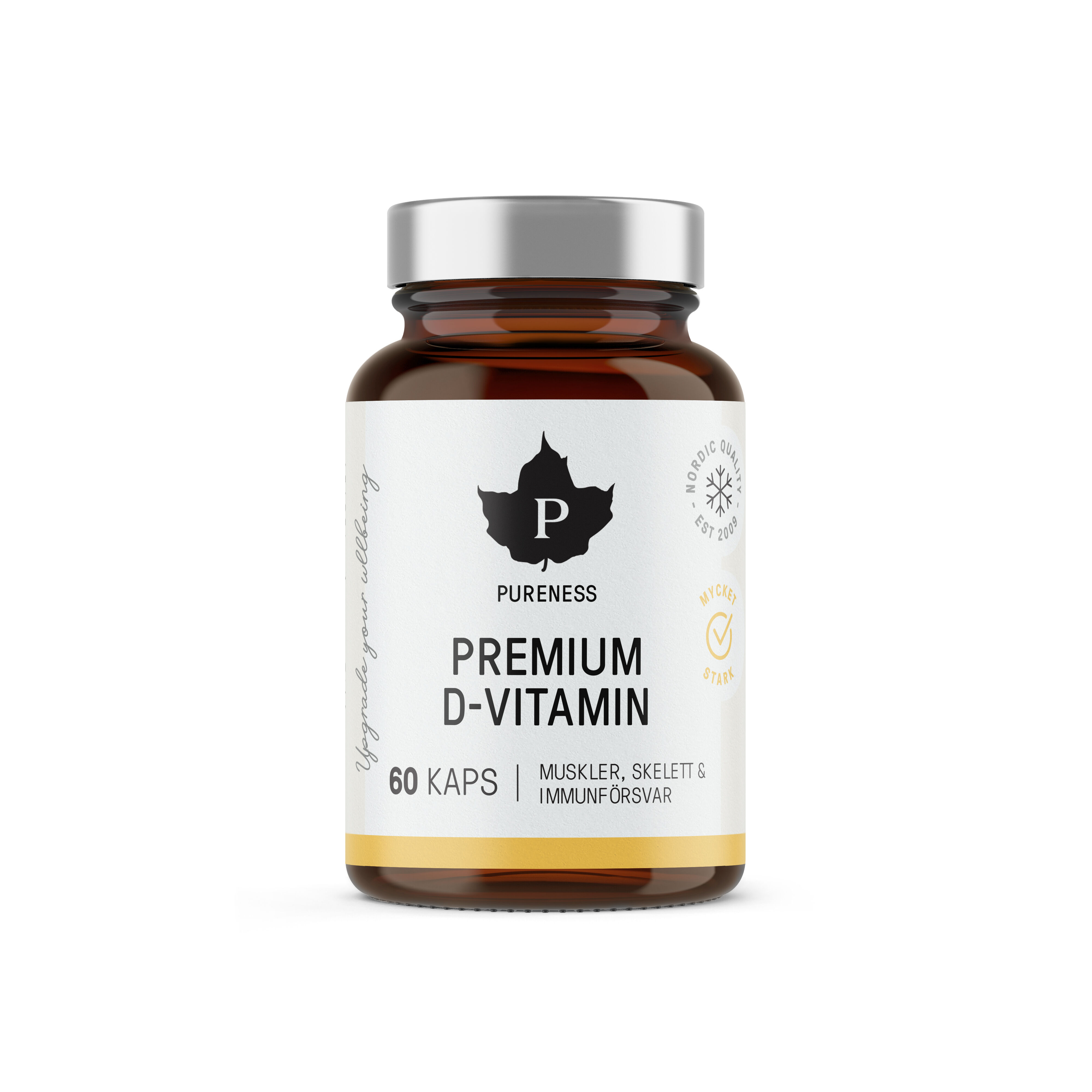 Premium D-vitamin är ett starkt 100 µg D3-vitaminpreparat som naturligt även innehåller A-vitamin. Den mjuka kapseln är torskleveroljebaserad med kolekalciferol från lanolin i fårull. Premium D-vitamin har en fettsammansättning av mycket hög klass från naturlig fiskolja, EPA- och DHA-fettsyror.