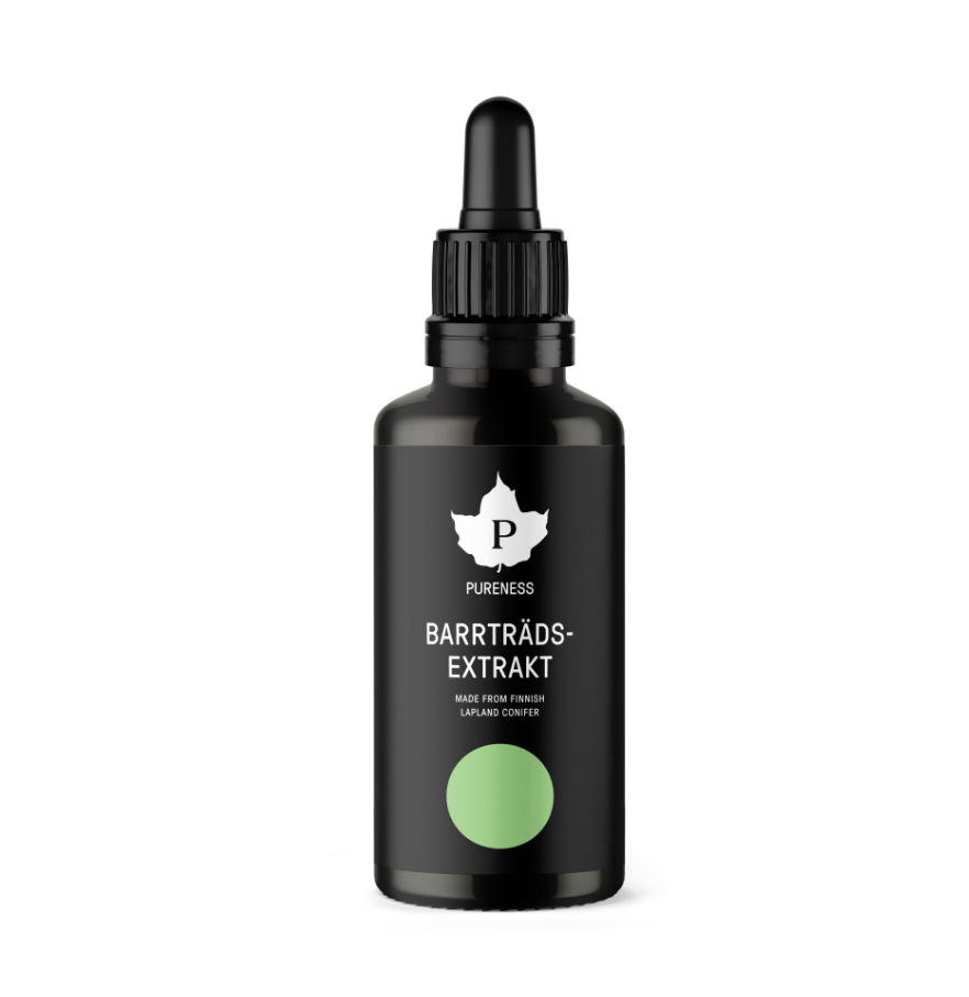 Pureness Barrträdsextrakt är en stark, flytande koncentration gjord på tallbark. Barken skördas försikigt för hand, från unga tallar i norra Finlands djupa skogar. Det är viktigt att tallen får växa långt från utsläpp och industrier. Tallbark är traditionellt använt i nordisk kost och hälsokost, särskilt i samekulturen. Tallbark är rikt på spännande ämnen för kroppen. Resveratrol, som man även hittar i lingon och vindruvans skal, fungerar som antioxidant. Bioflavonoider (som tidigare kallades P-vitamin) och proantocyanidiner (OPC) är andra favoriter i barkextraktet. Pureness produkter ska alltid vara fulla med näring. Därför har de använt både vatten och alkohol i bryggningen av barrträdsextraktet. På så sätt kan man lättare få ut alla näringsämnen. De har sen tagit bort överflödigt vatten, och resultatet är ett högpotent extrakt. Du behöver bara en droppe åt gången!