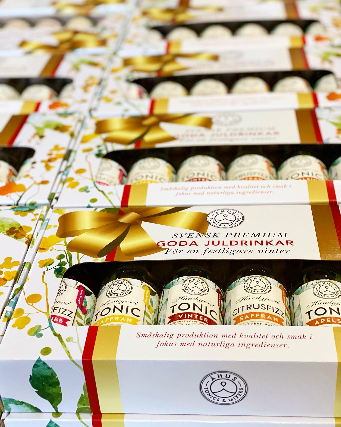 Åhus Tonic 6-pack Julförpackning – En stilfull och festlig förpackning som innehåller sex olika varianter av smakrika drinkmixers från Åhus. Här handlar det om småskalig produktion där varje detalj fokuserar på kvalitet och utsökt smak, med naturliga ingredienser i centrum. Dryckerna är tillverkade med färska frukter och grönsaker och är helt fria från onödiga tillsatser. Precis som vi bryr oss om vad vi äter, spelar det också roll vilka råvaror som används i våra drycker. Åhus Tonic & Mixers satsar därför på att använda råvaror av högsta kvalitet. De lägger både extra tid och resurser på att skapa sina mixers med omsorg, och resultatet är en smakupplevelse utöver det vanliga. Det kanske är svårt att hitta en mer exklusiv och uppskattad julklapp eller företagsgåva än denna kombination av högkvalitativa drinkmixers.