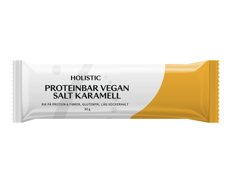 Holistic Proteinbar Vegan Salt karamell är en proteinbar med smak av salt kola och med ett överdrag av mörk choklad. Kan det bli så mycket bättre? I detta paket ingår 12 st 50g bars med salt karamell.