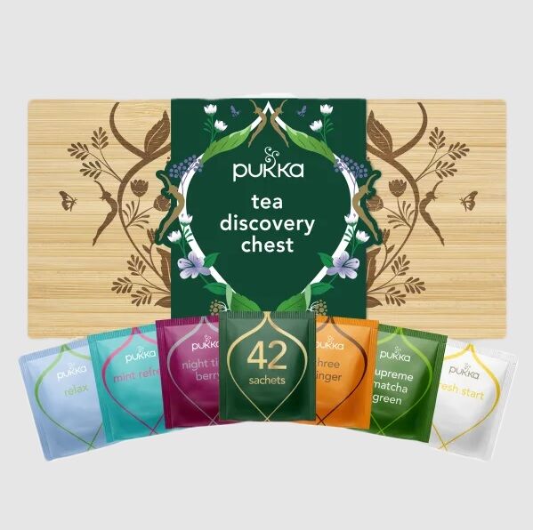 Pukkas Tea Discovery Chest innehåller teerna: Supreme Matcha Green Relax Fresh Start Mint Refresh Three Ginger Night Time Berry
