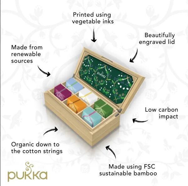 Pukkas bambulåda innehåller sex olika örtteer - från lugnande örter för en avkopplande testund, till uppfriskande teer som väcker sinnena till liv.