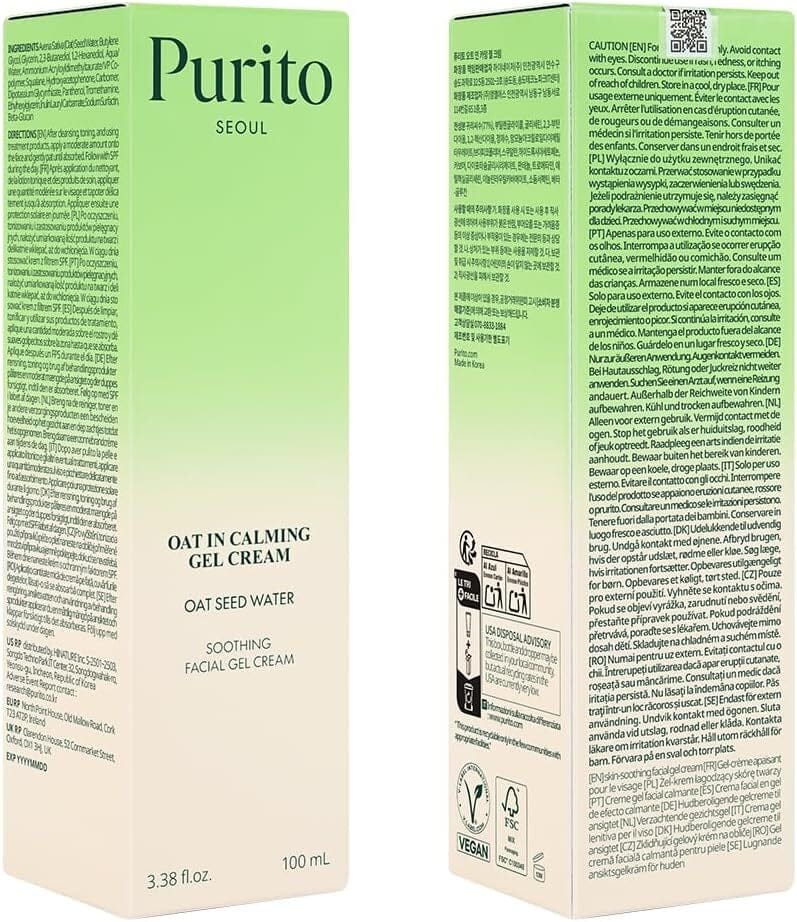 PURITO Oat-in Calming Facial Gel Cream är en lätt och svalkande gelkräm framtagen för att lugna, återfukta och stärka hudbarriären hos känslig och irriterad hud. Formulan innehåller hela 77 % havrevatten (beta-glukan) som hjälper till att skydda huden, minska obehag och bevara fuktbalansen. Tillsammans med panthenol och squalane ger krämen intensiv näring utan att kännas tung eller fet. Den snabbabsorberande gelkonsistensen gör krämen idealisk för daglig användning, även för hud som lätt reagerar på yttre påverkan. Ett tryggt val för barriärfokuserad hudvård från PURITO.