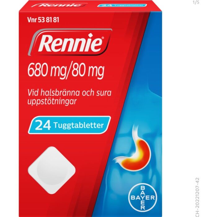 Rennie tuggtabletter är ett receptfritt läkemedel som ger lindring vid halsbränna och sura uppstötningar, samt syrarelaterad smärta i maggropen. Rennie binder överskott av saltsyra i magen. Den syrabindande effekten kommer inom några minuter. En tablett binder ca 15,2 mmol saltsyra. Tabletterna har en smak av pepparmint.