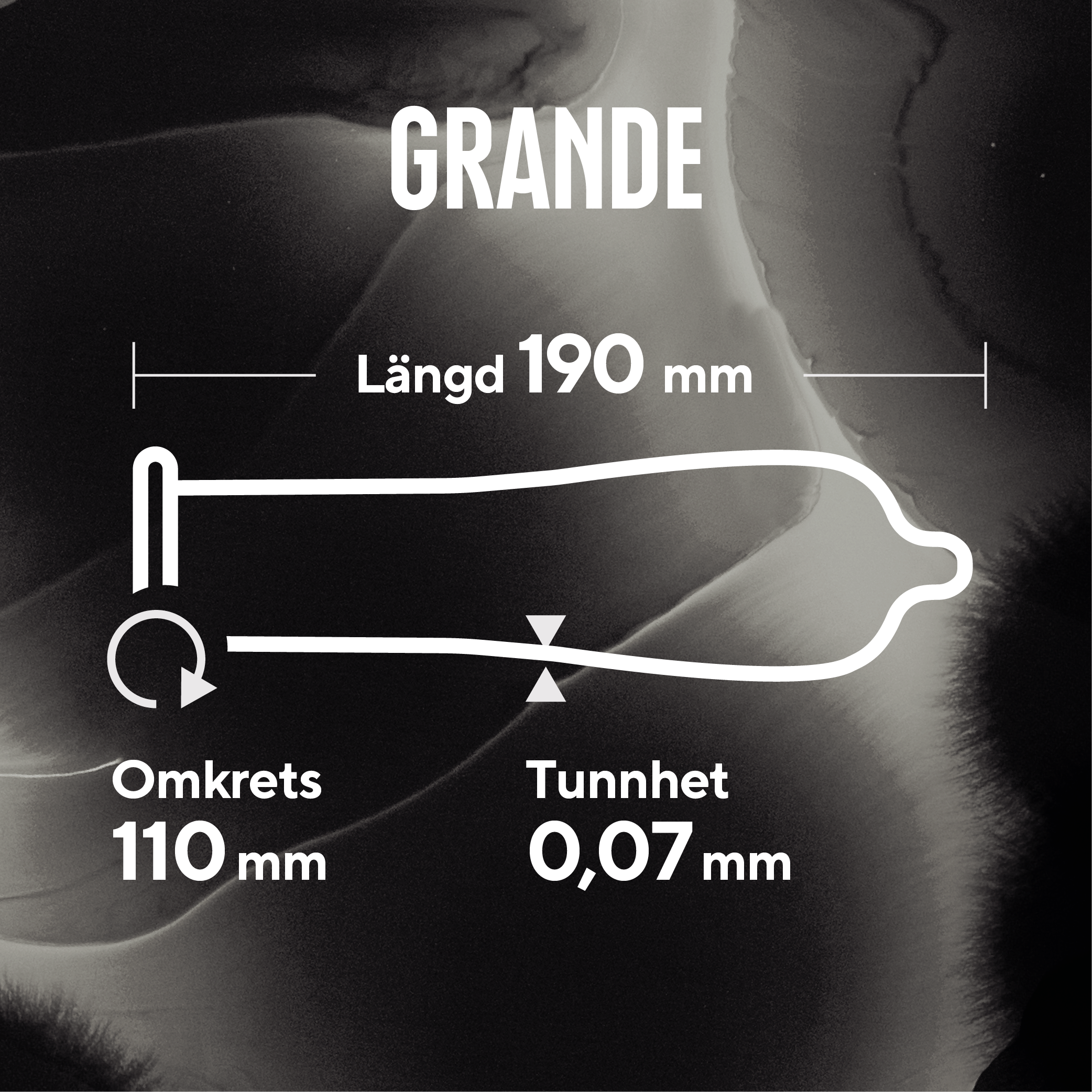 Något längre, bredare och tjockare kondom. Favoriten för de som önskar en rymligare känsla. RFSU Grande är extra rymliga och säkra kondomer med generös form som ger bättre passform och känsla! Ofärgad latexkondom med slät yta, behållare och glidmedel. Bredd 55 mm