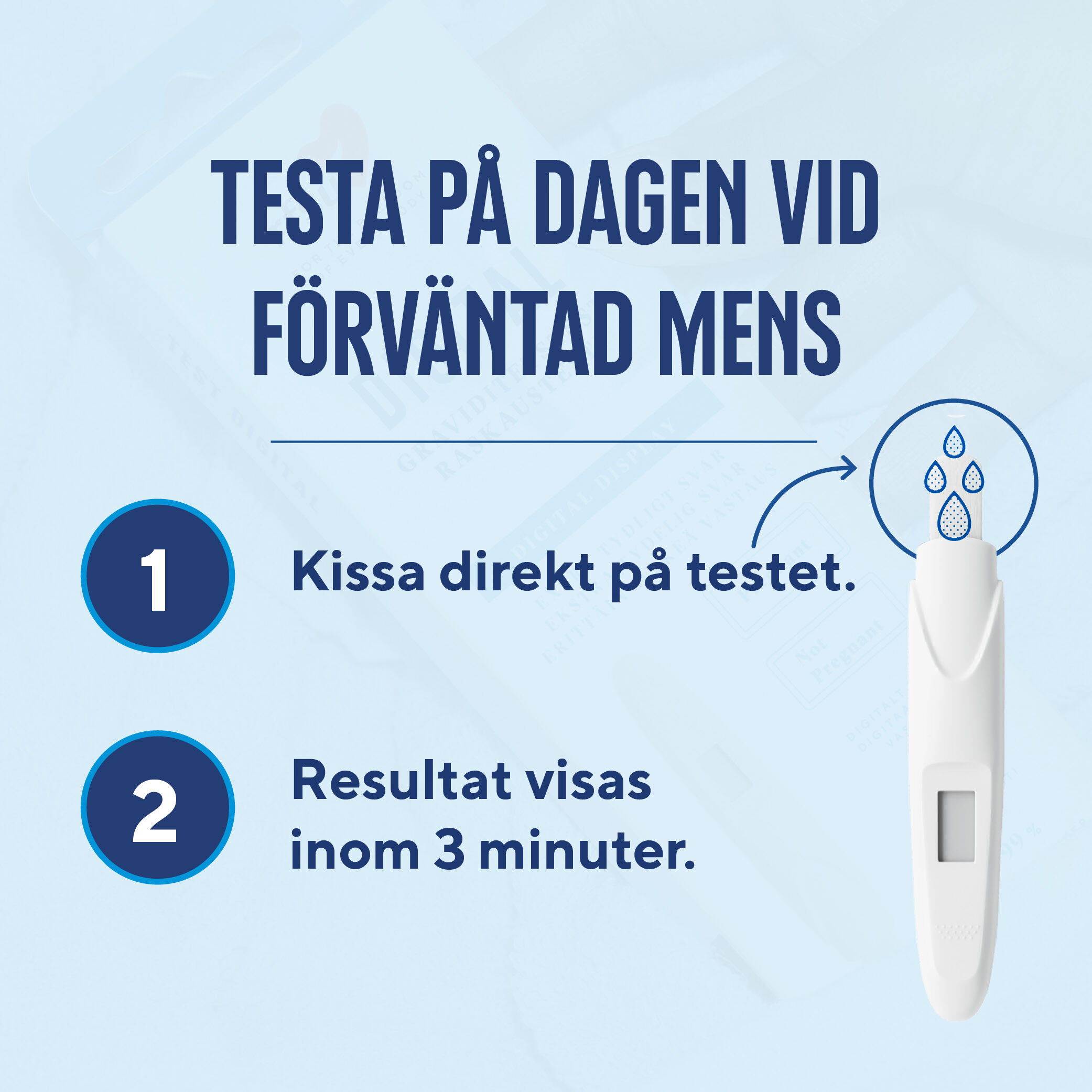 Med RFSU Graviditetstest Digital kan du snabbt och enkelt ta reda på om du är gravid. Det digitala testet ger ett tydligt provsvar med texten ”Pregnant” = Gravid eller ”Not Pregnant" = Inte gravid”. Du kan göra testet från och med den dag som du väntar din mens.