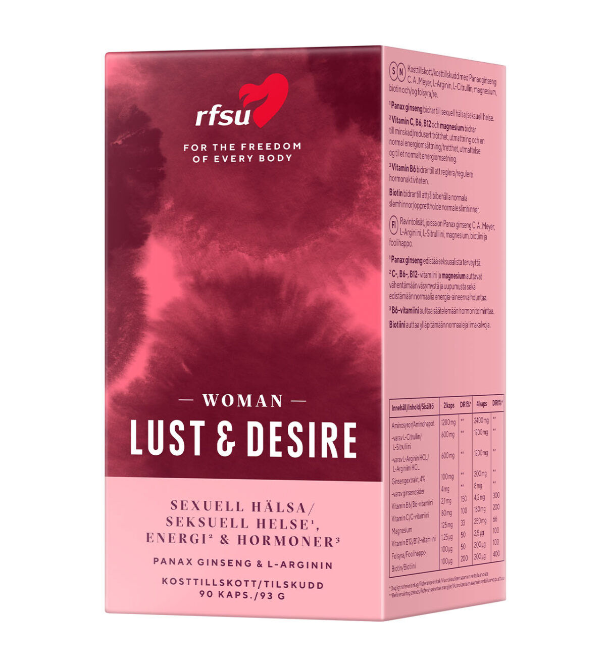 RFSU Lust & Desire Woman innehåller ginseng och aminosyrorna L-Arginin och L-Citrullin men också flera olika vitaminer och mineraler såsom magnesium, biotin, folsyra, vitamin C, vitamin B6 och vitamin B12.