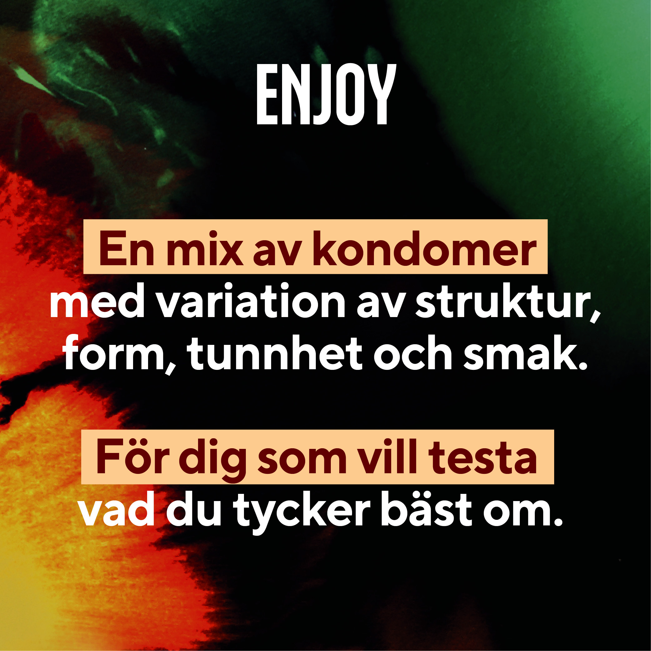 RFSU Enjoy är ett 30-pack kondomer som innehåller en spännande mix. RFSU Enjoy passar dig som vill känna dig för, testa nytt eller som vill ha variation. Enjoy-mixen innehåller kondomer med olika passform, tunnhet, struktur och arom i glidmedlet.