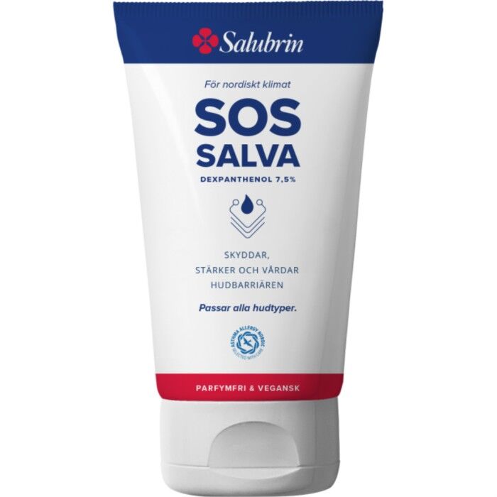 Salubrin SOS Salva är en skyddande och vårdande salva med 7,5% dexpanthenol som kan användas till torra hudområden på hela kroppen. Salvan är utvecklad för att vårda torr hud och kan användas på narig hud och på små hudsprickor. Salvan har en förmåga att binda fukt till huden så att huden inte torkar ut.