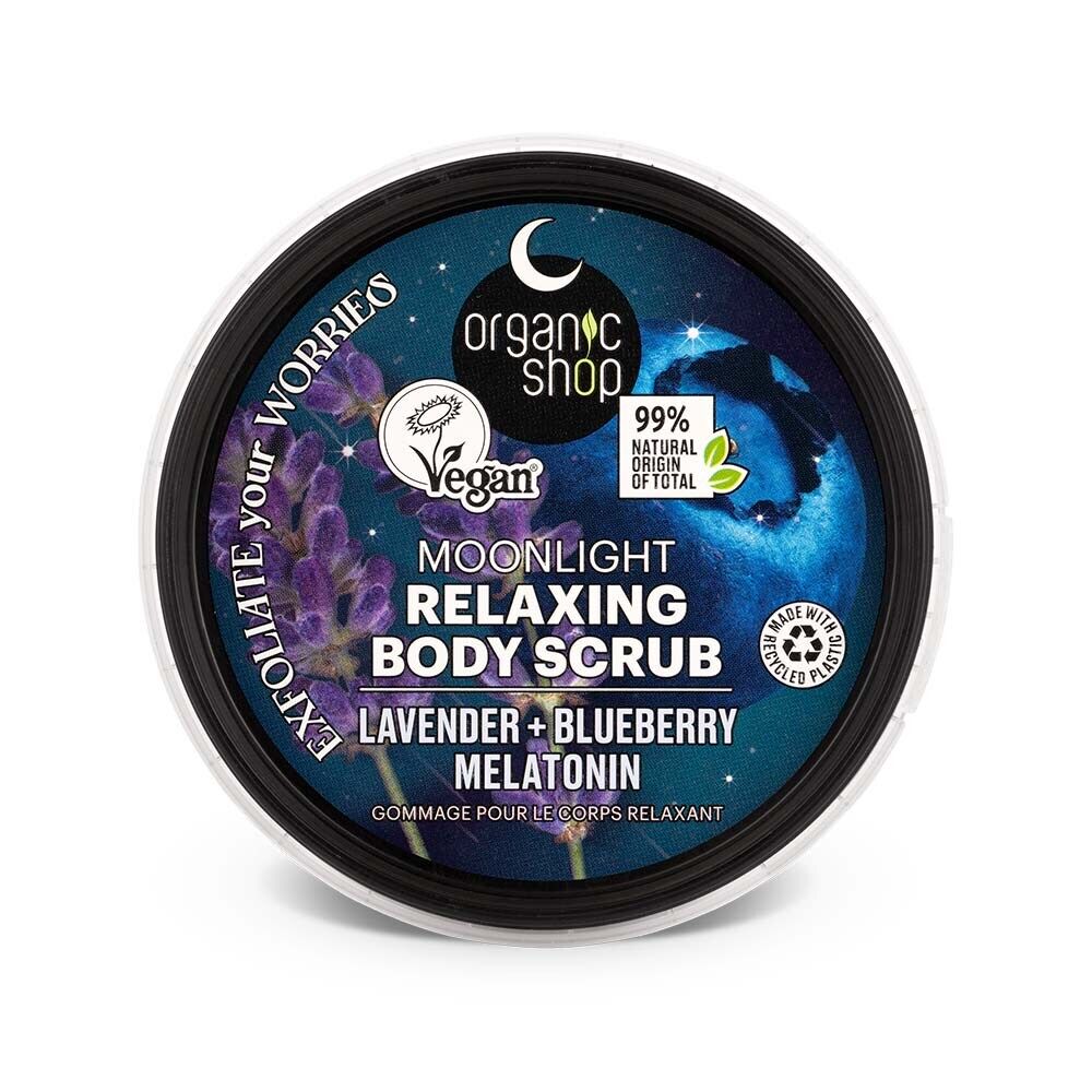 Organic Shop Moonlight Relaxing Body Scrub är den perfekta kvällsrutinen för dig som söker balans, lugn och mjuk hud. Med sin harmoniska blandning av lavendel, blåbär och melatonin exfolierar den huden skonsamt, avlägsnar döda hudceller och återställer hudens lyster och mjukhet.
