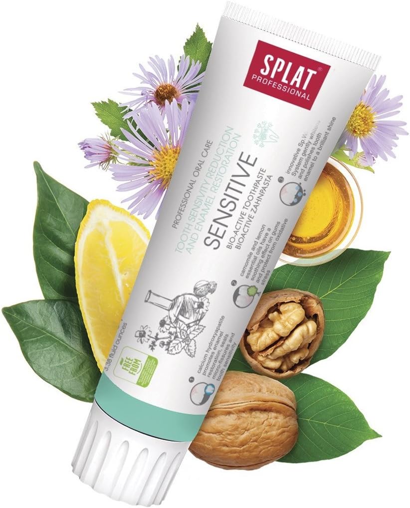 Splat Sensitive Tandkräm med effektiv förstärkning kompenserar för mineralförlust och minskar tandkänsligheten.