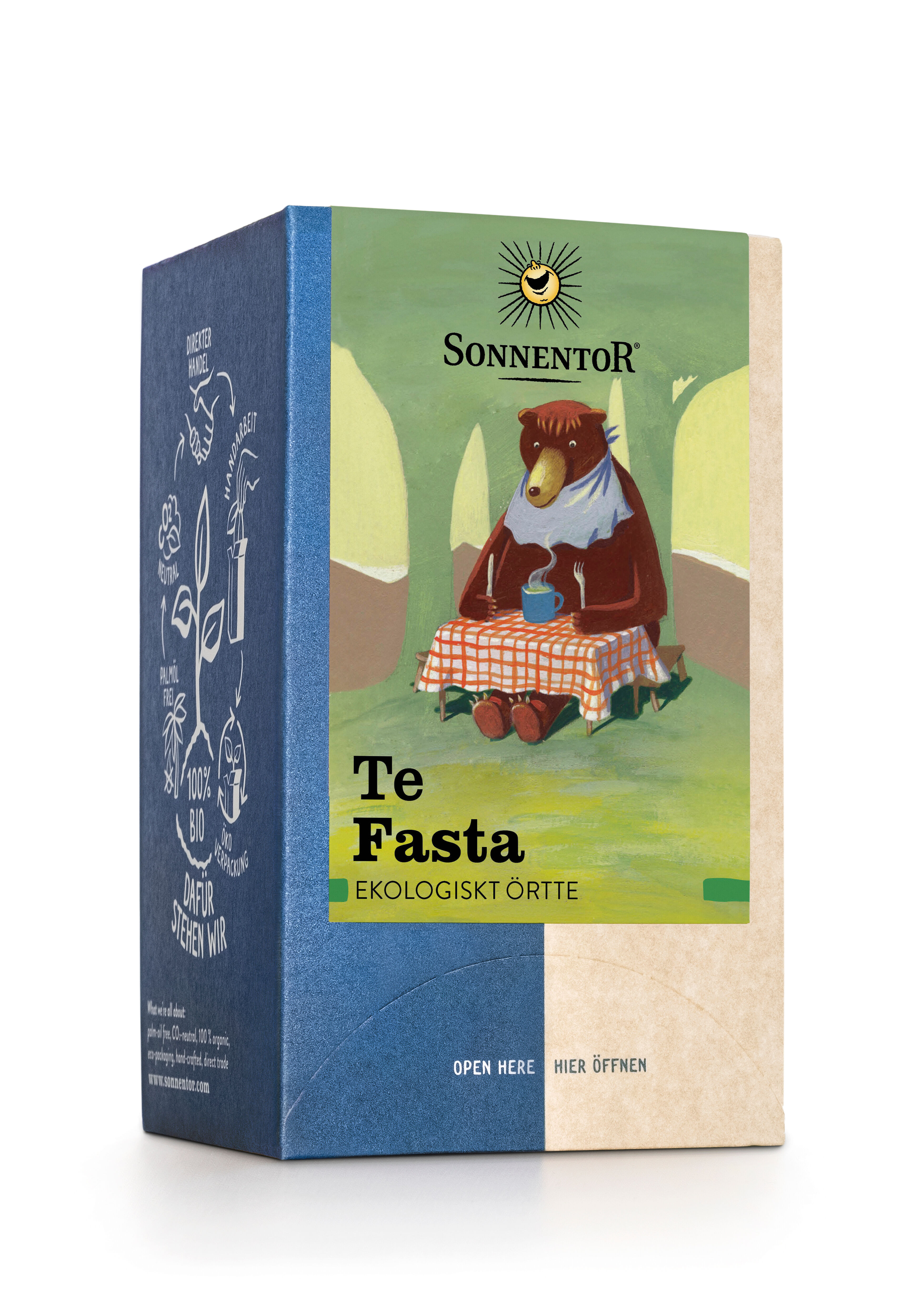 Sonnentors te fasta är ett blommigt, ekologiskt örtte med bland annat citronmeliss, björnbärsblad och brännässla, framtaget för att stödja matsmältningen.