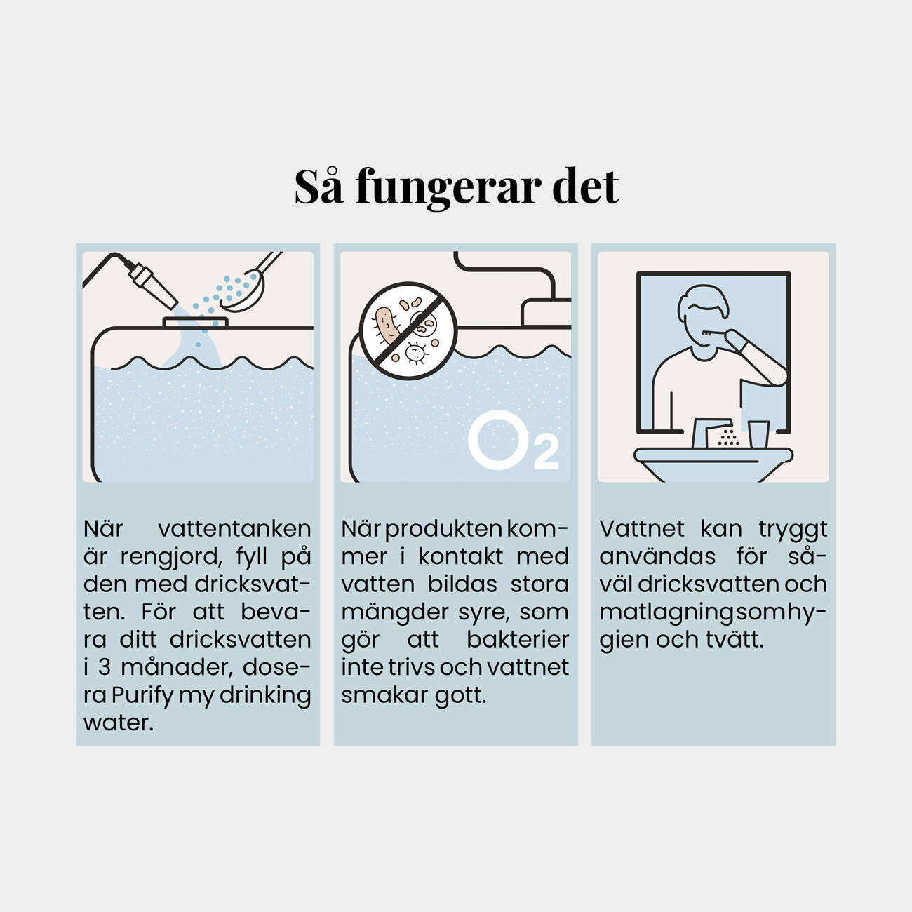 Välj mellan tabletter och pulver i olika storlekar, så att du alltid har en lösning som passar din tank – från 50 till 3 000 liter rent vatten per förpackning. Förvaras i normal rumstemperatur och ej i direkt solljus. Tillverkad i Sverige.