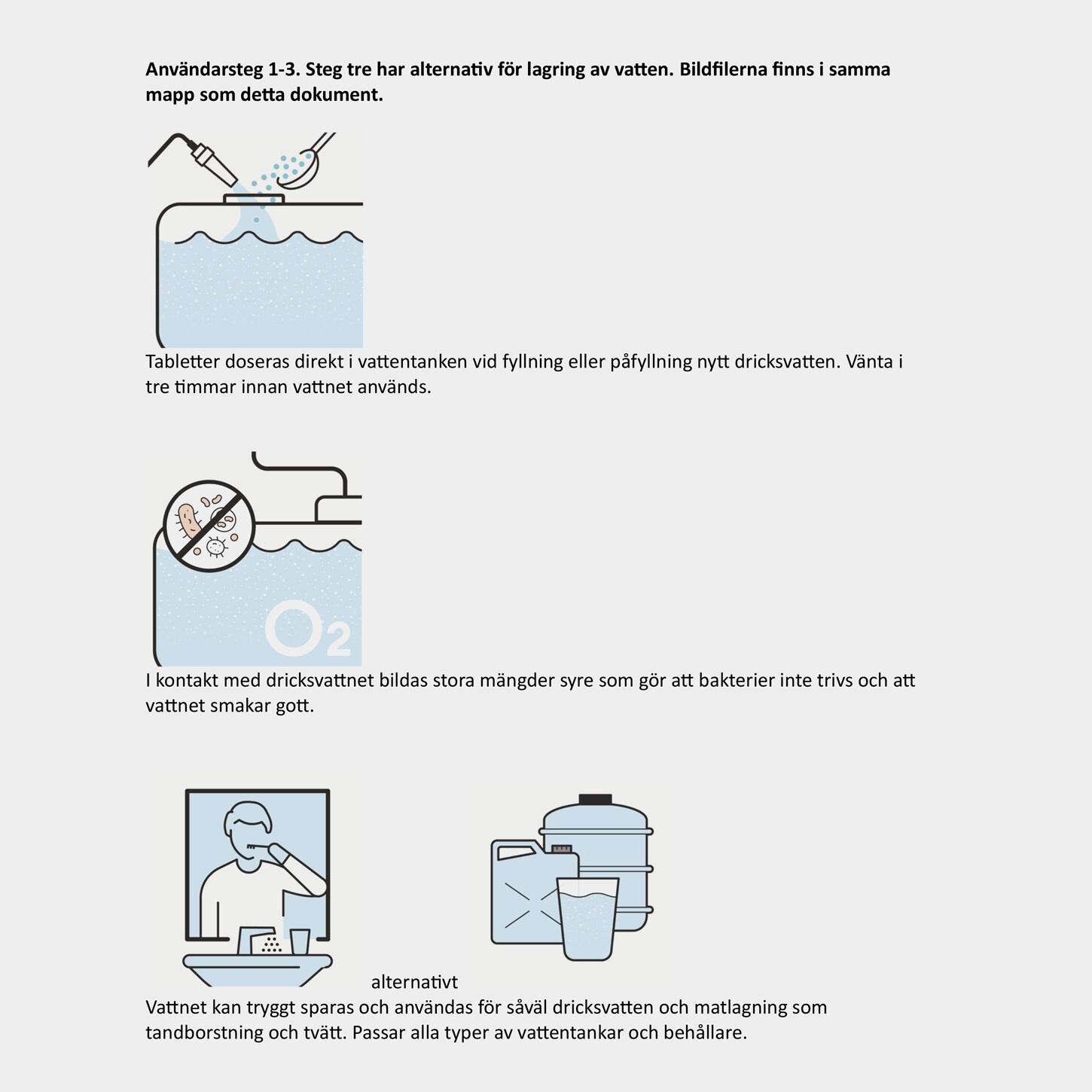 Vid påfyllning av nytt vatten i tanken, dosera motsvarande antal tabletter i enlighet med användarinstruktionerna. Fungerar i alla typer av vattentankar av såväl metall som plast.