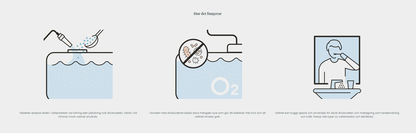 Enkel att använda, tillsätt bara en tablett eller mät upp pulver, vänta tre timmar och njut sedan av säkert, fräscht vatten – precis som hemma. Lämpligt för längre och kortare resor med båten, husbilen eller husvagnen.