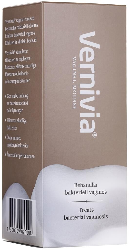 Vernivia Vaginal Mousse används för att behandla bakteriell obalans i slidan, ett tillstånd som kallas bakteriell vaginos. Moussen ger snabb lindring av besvärande lukt och flytningar, med kliniskt bevisad effekt. Fördelen med Vernivia vaginalmousse är att den sprids i hela slidan och behandlar därför effektivt hela slidväggens yta.
