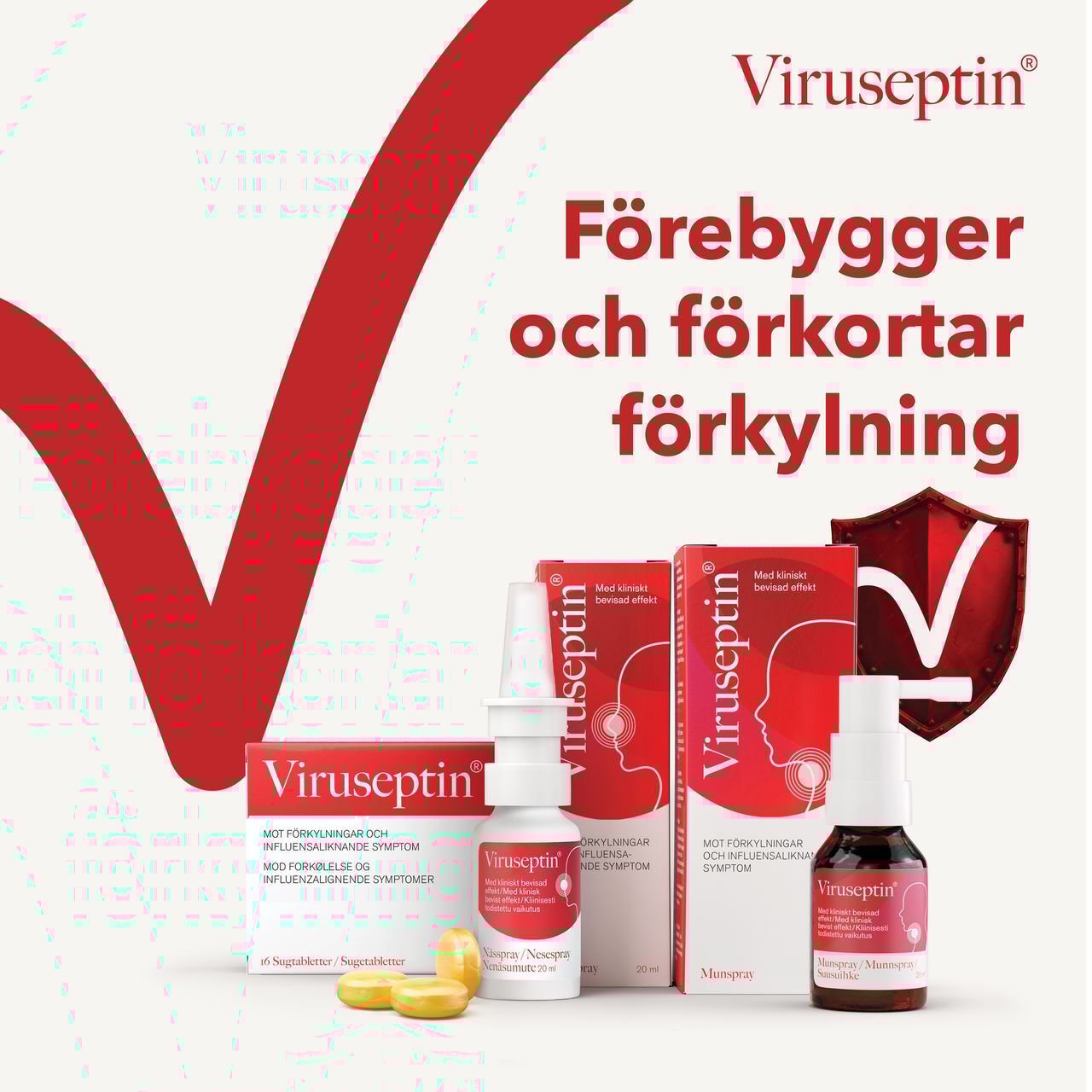 Sugtabletter med kliniskt bevisad effekt mot förkylning och influensaliknande symtom orsakade av virus. Viruseptein bildar en skyddande barriär mot vanliga förkylnings- och influensavirus och hjälper kroppens eget försvar att bekämpa virus i övre luftvägarna. Det aktiva ämnet omsluter viruspartiklarna och förhindrar att de får fäste i munnen och svalget vilket minskar ökning och spridning av viruset.