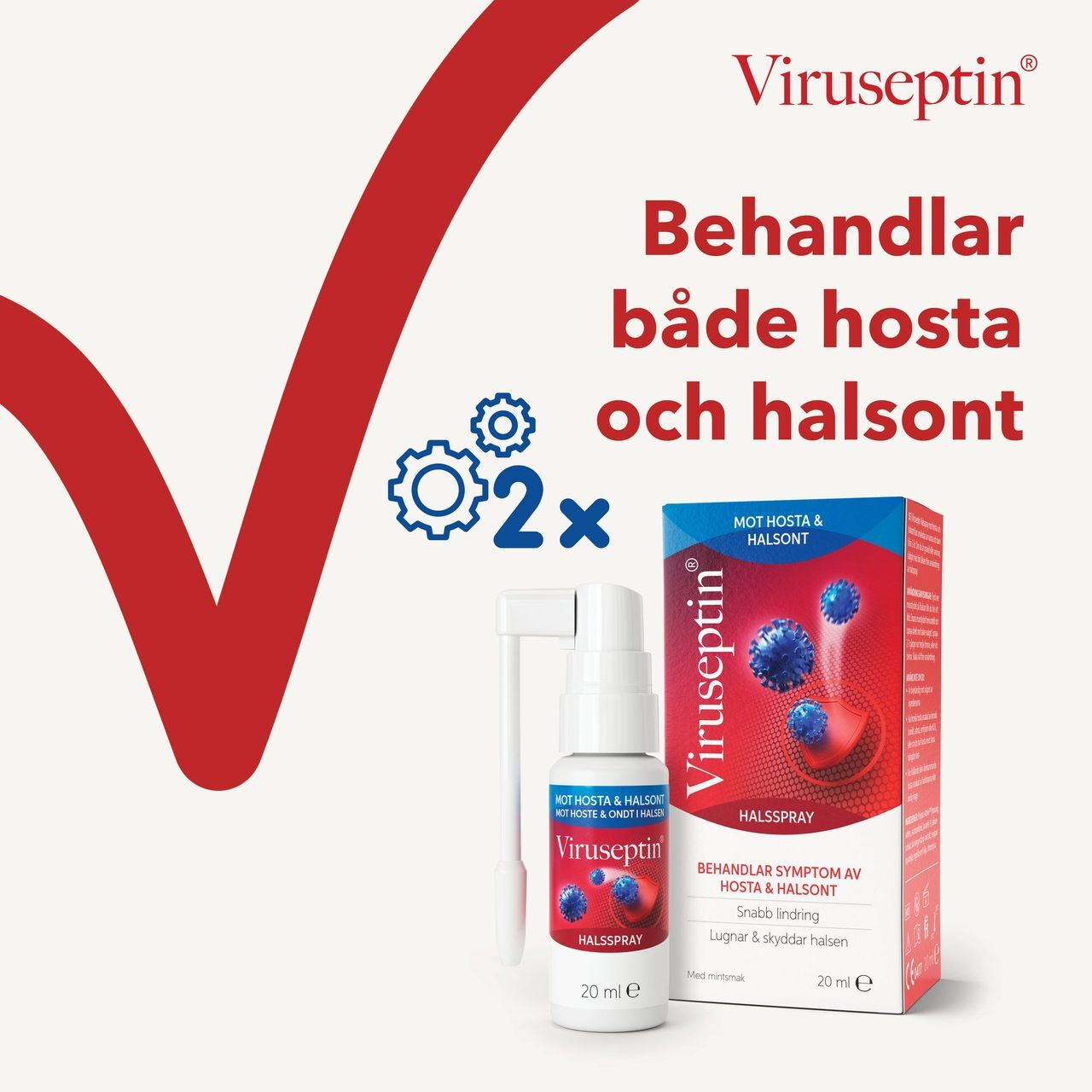 Viruseptin Throat Spray behandlar och minskar hosta och symptom i halsen förknippade med vanlig förkylning. Sprayen ger snabb lindring av både hosta och ont i halsen. Den skapar omedelbart ett fysiskt lager i svalget, vilket skyddar, smörjer och återfuktar irriterade slemhinnor. Med smak av mint.