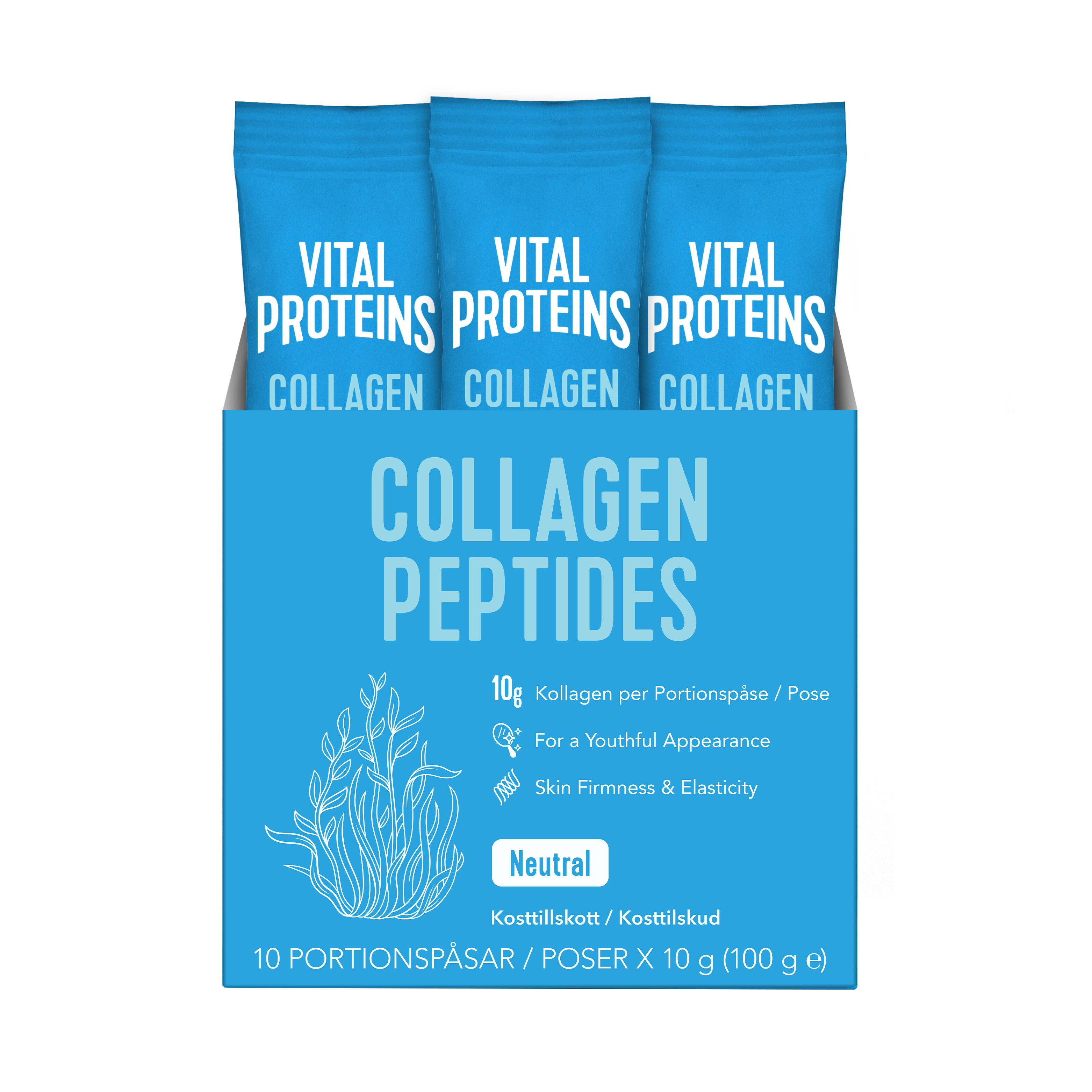 Vital Proteins Collagen Peptides Stick Pack 10x10g är ett kollagentillskott i pulverform med neutral smak.