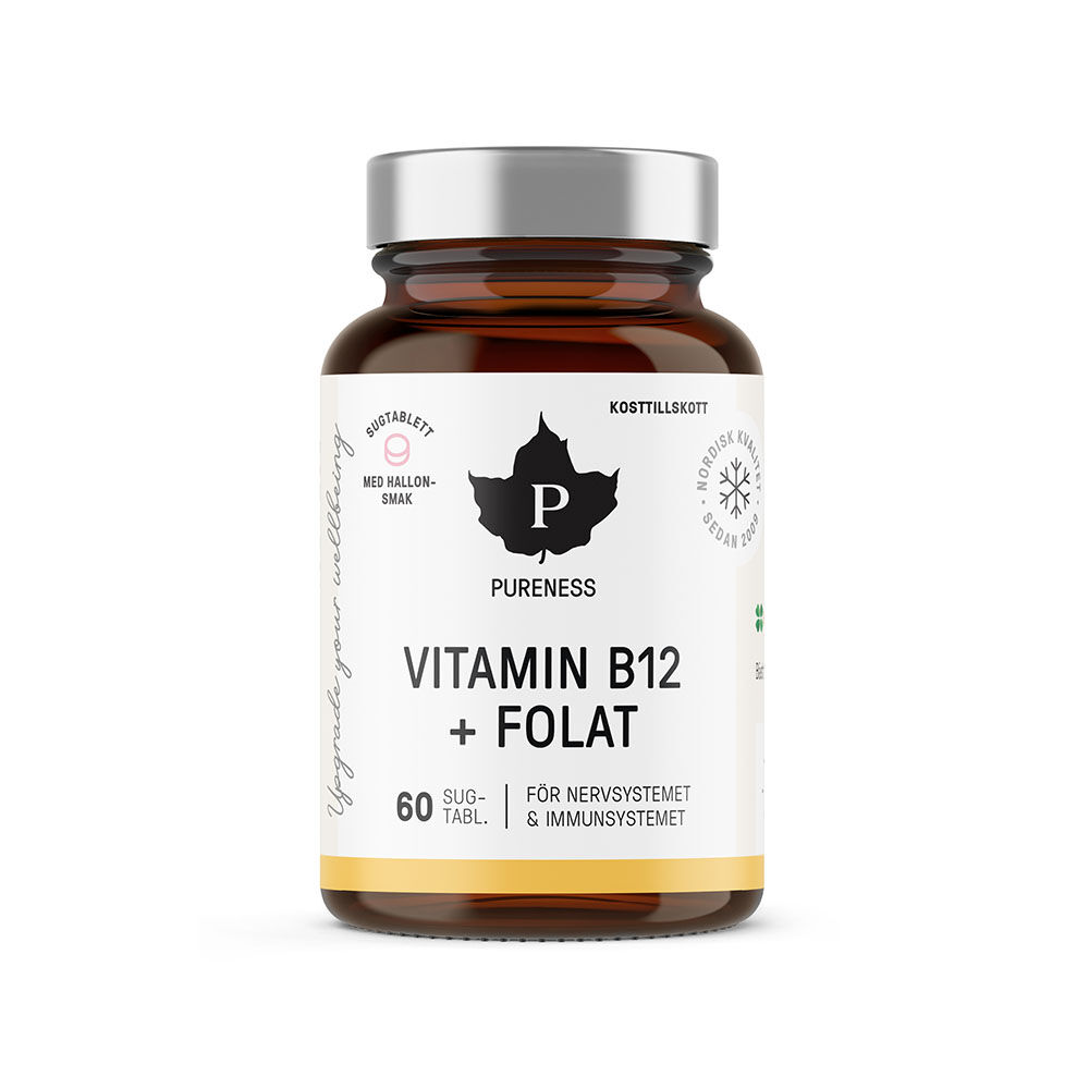 Pureness Vitamin B12 + Folat är ett kosttillskott i form av sugtabletter med hallonsmak, som innehåller aktiva former av vitamin B12. Vitamin B12 stödjer immunsystemets och nervsystemets normala funktion samt spelar en viktig roll i energiomsättningen. Eftersom aktiva former av B12 främst återfinns i animaliska livsmedel, är detta tillskott särskilt fördelaktigt för vegetarianer och veganer. Det är även lämpligt för äldre personer, då kroppens förmåga att absorbera vitaminet minskar med åldern. Pureness Vitamin B12 + Folat absorberas snabbt och effektivt genom munhålans slemhinnor. Kosttillskottet innehåller även Quatrefolic®️, en aktiv form av vitamin B9 (folat), som bidrar till normal psykologisk funktion.