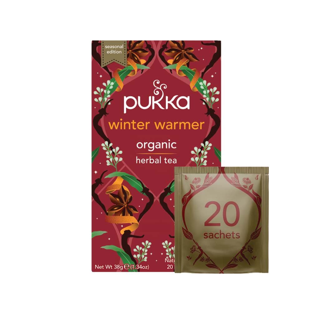 Winter Warmer 20 påsar från Pukka är ett juligt te & innehåller 100% ekologiska ingredienser som ingefära, apelsin &kanel vars skarpa kryddighet känns som värme i kroppen.