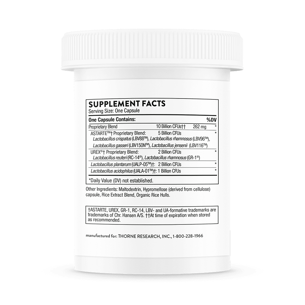 Kvinnor har unika behov, och de flesta kvinnor upplever vaginal- och urinproblem under hela sitt liv – antingen dagligen eller ibland. Thorne's Women's Daily Probiotic är formulerad med två väl studerade proprietära probiotiska blandningar, förutom två Lactobacillus- arter.